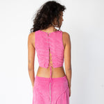 - italian wide wale corduroy - fully lined - form fitting with lacing at back for adjustability - exposed metal zipper at front - double layer panels wrapping the body