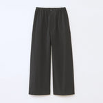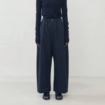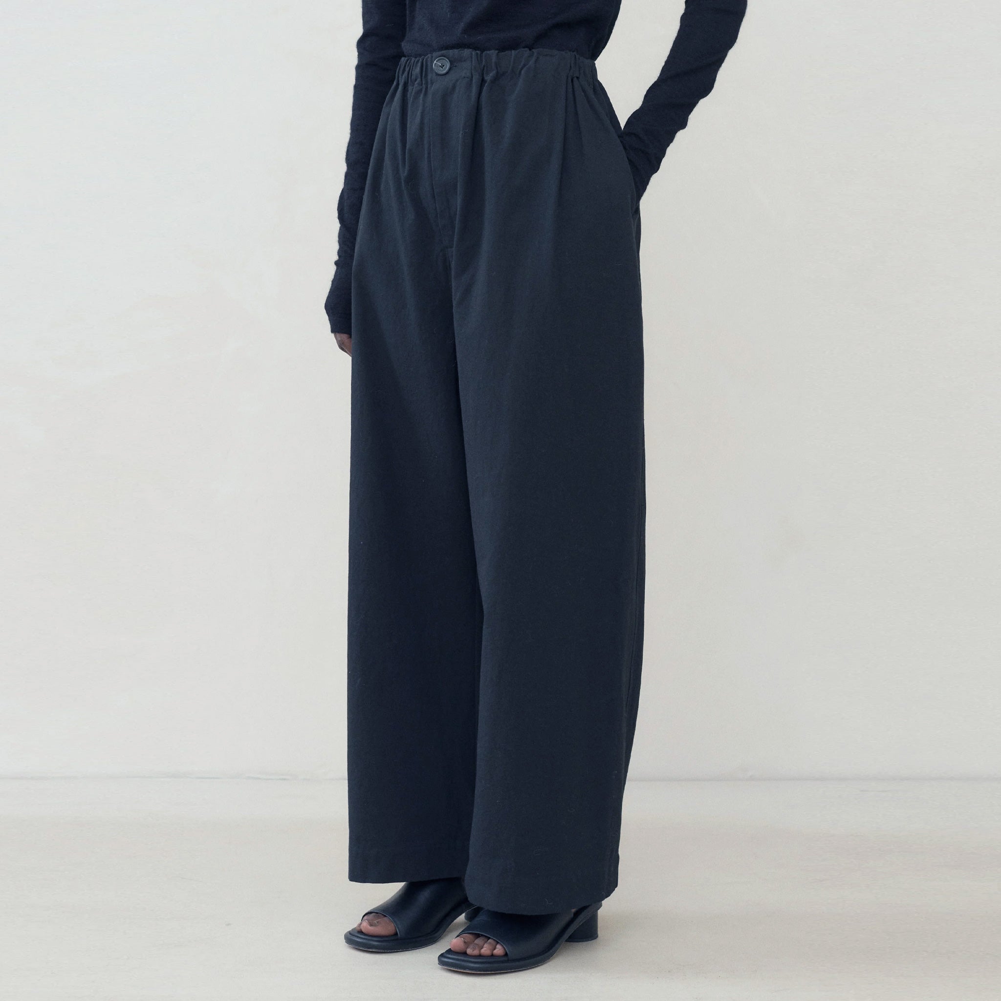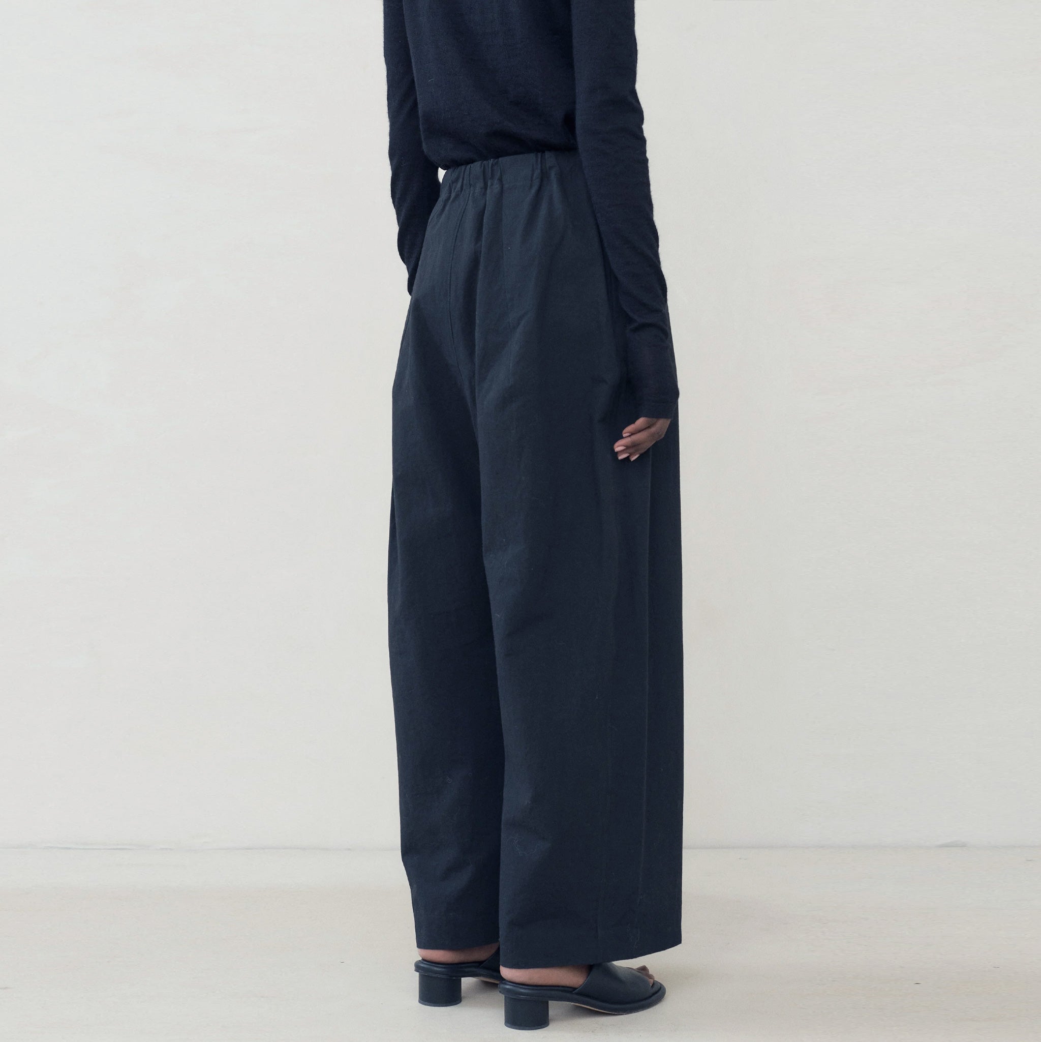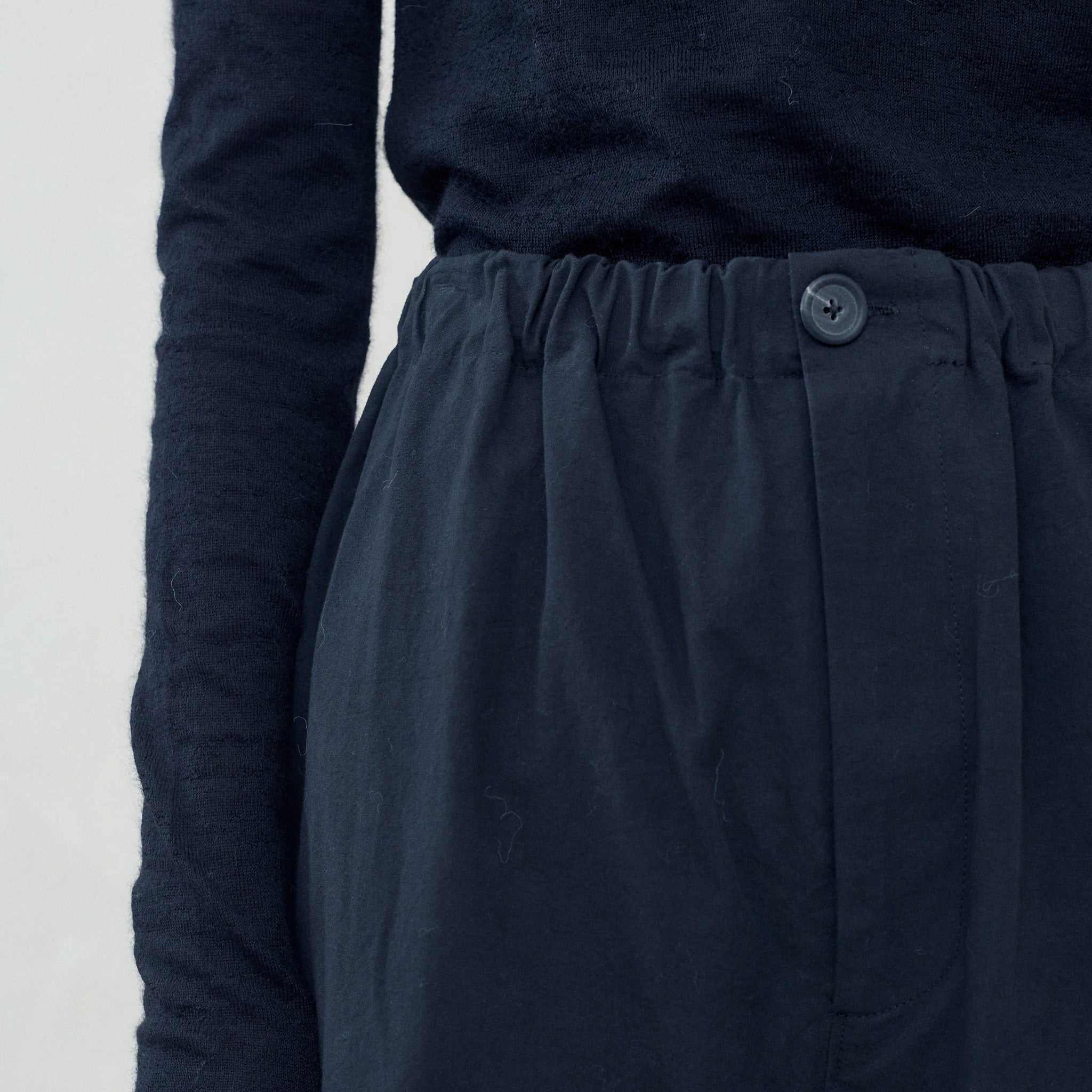 Crisp matte cotton trousers with a wide silhouette and elastic waistband with button closure. Interior drawstring for an adjustable waistline. Side seam pockets. Warm hand feel. 100% cotton.
