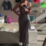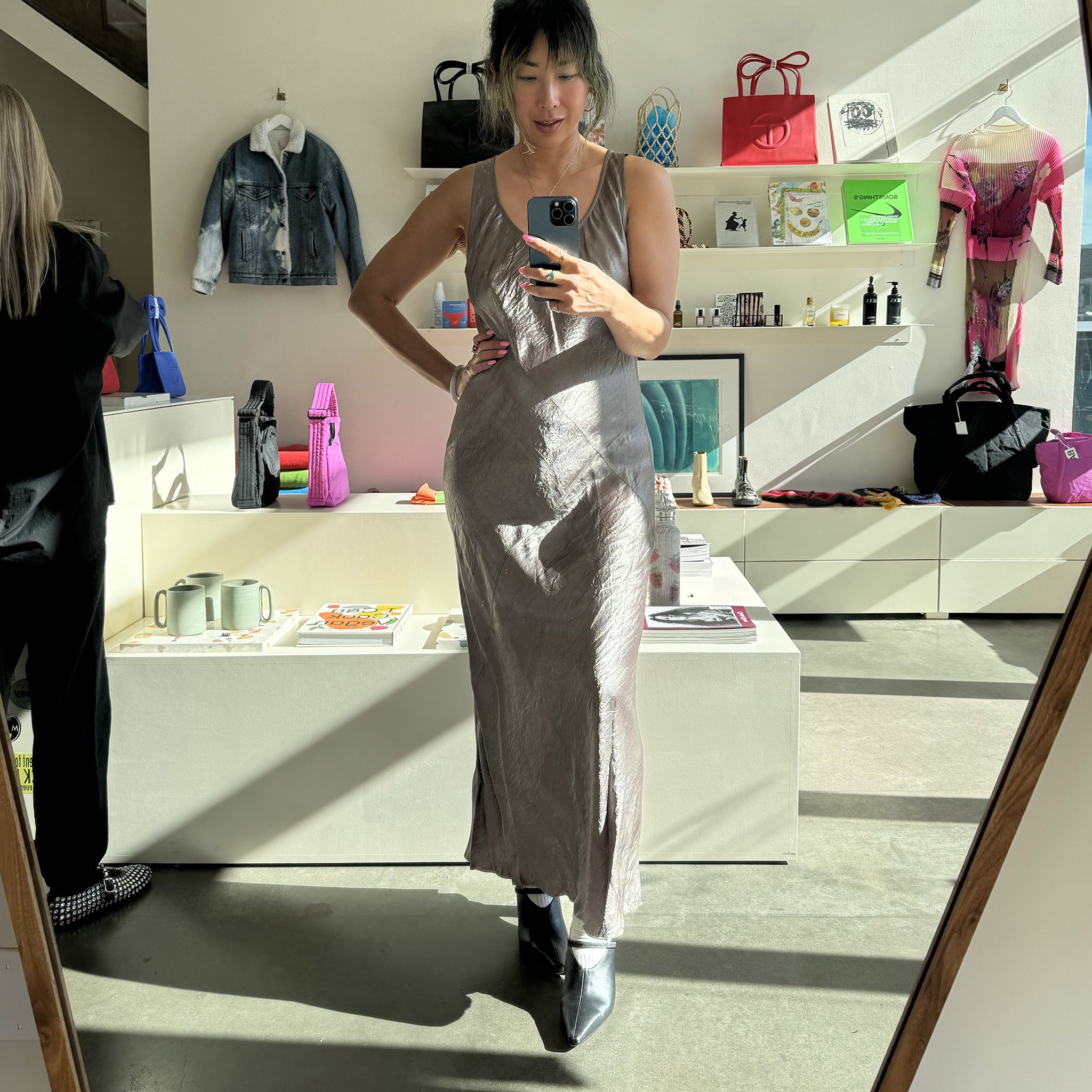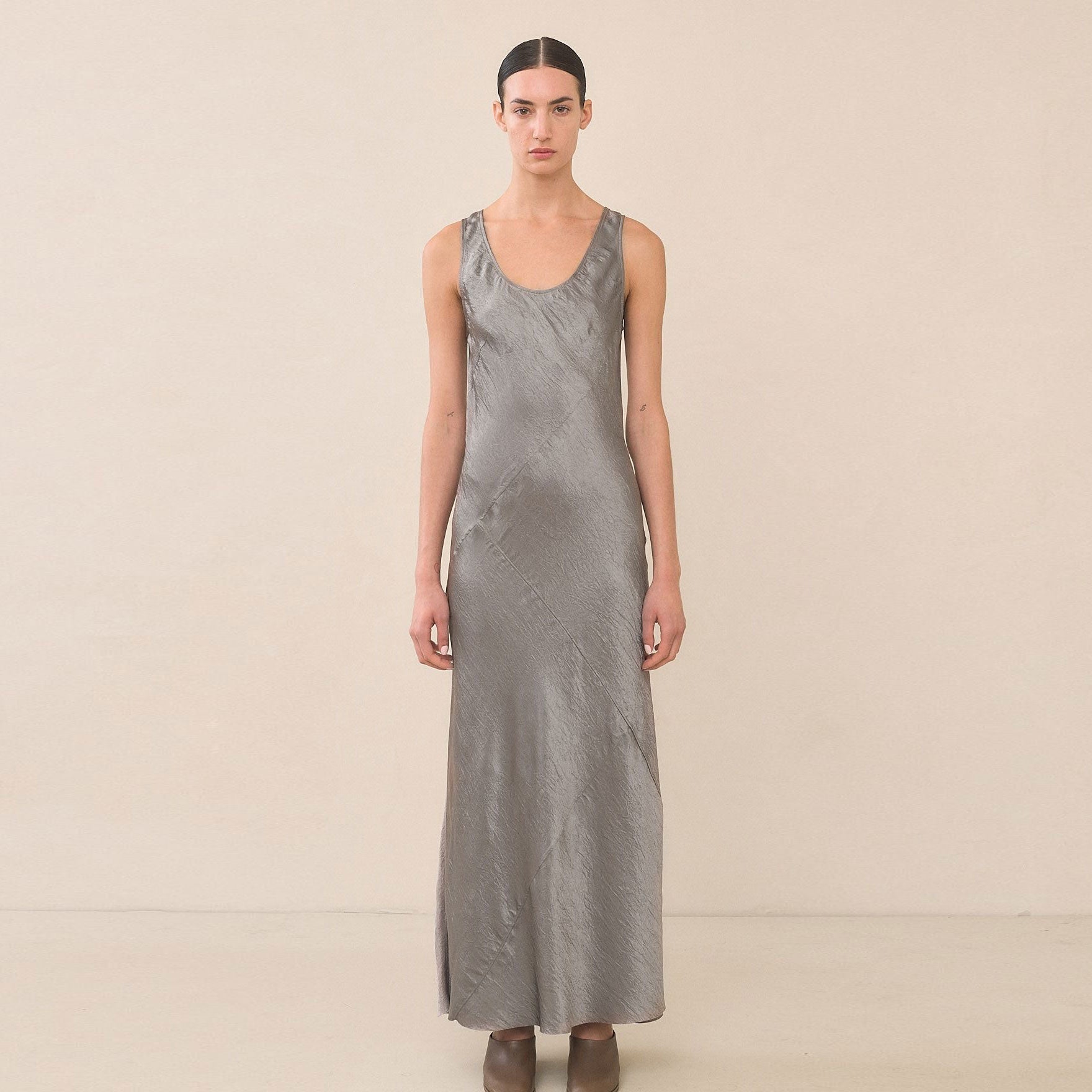 Gorgeous rayon dress with a beautiful soft sheen and subtle crinkled texture. Draped bias fit to follow the slope of the body.