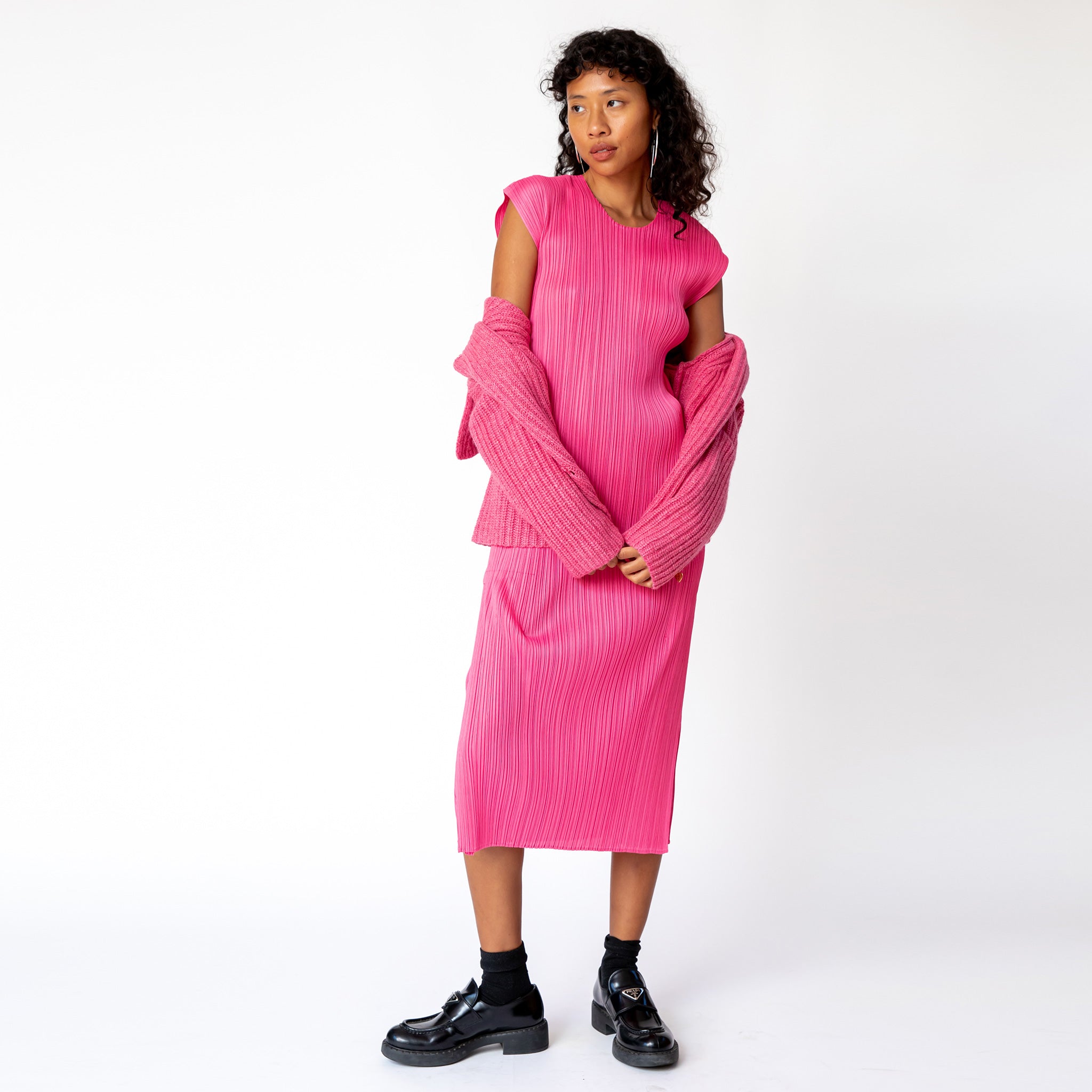 Short sleeved pleated dress in a new monthly color of bright pink.