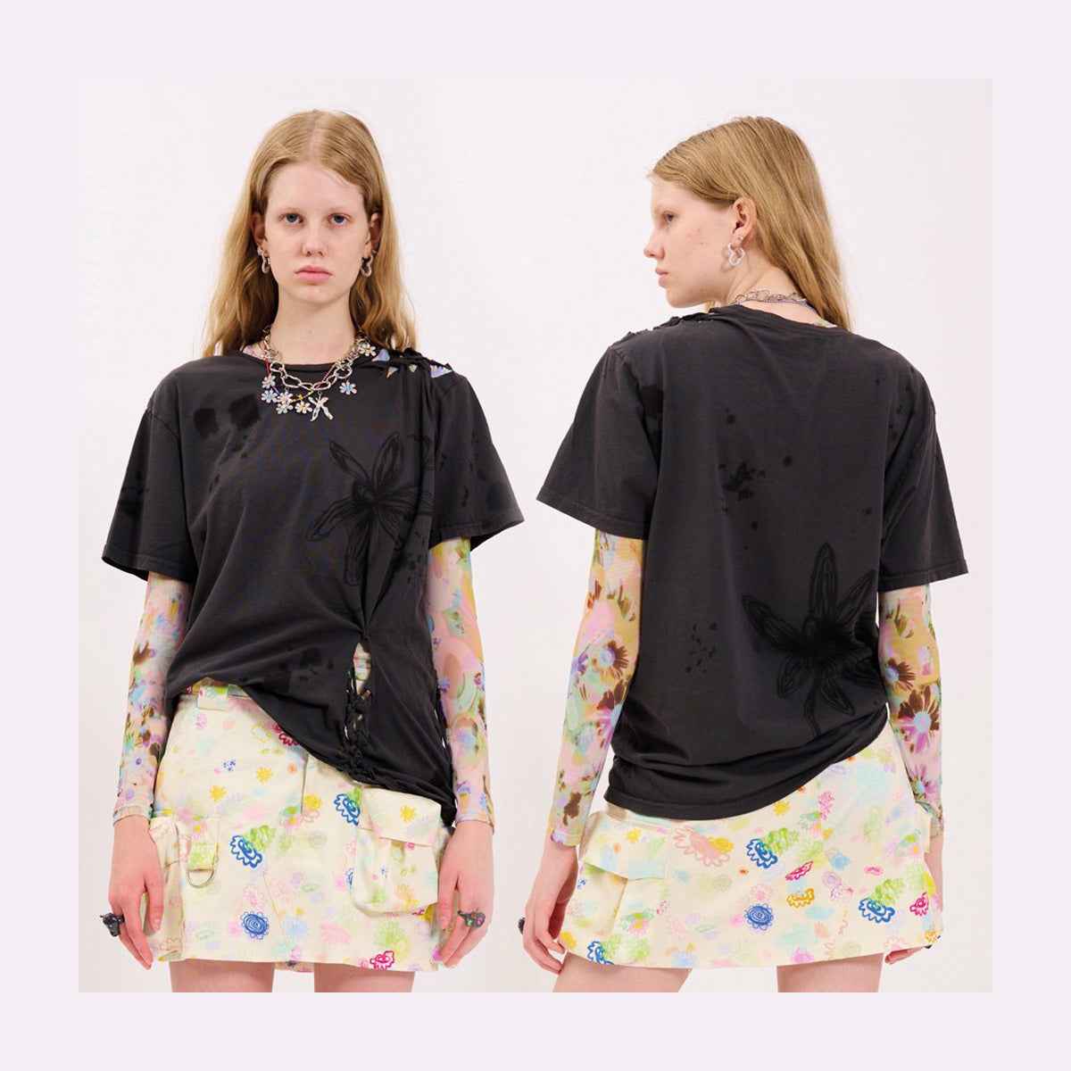 Hand painted tee with raw edge openings and knitted detail. Boxy fit. Made from 100% organic cotton.