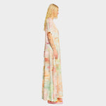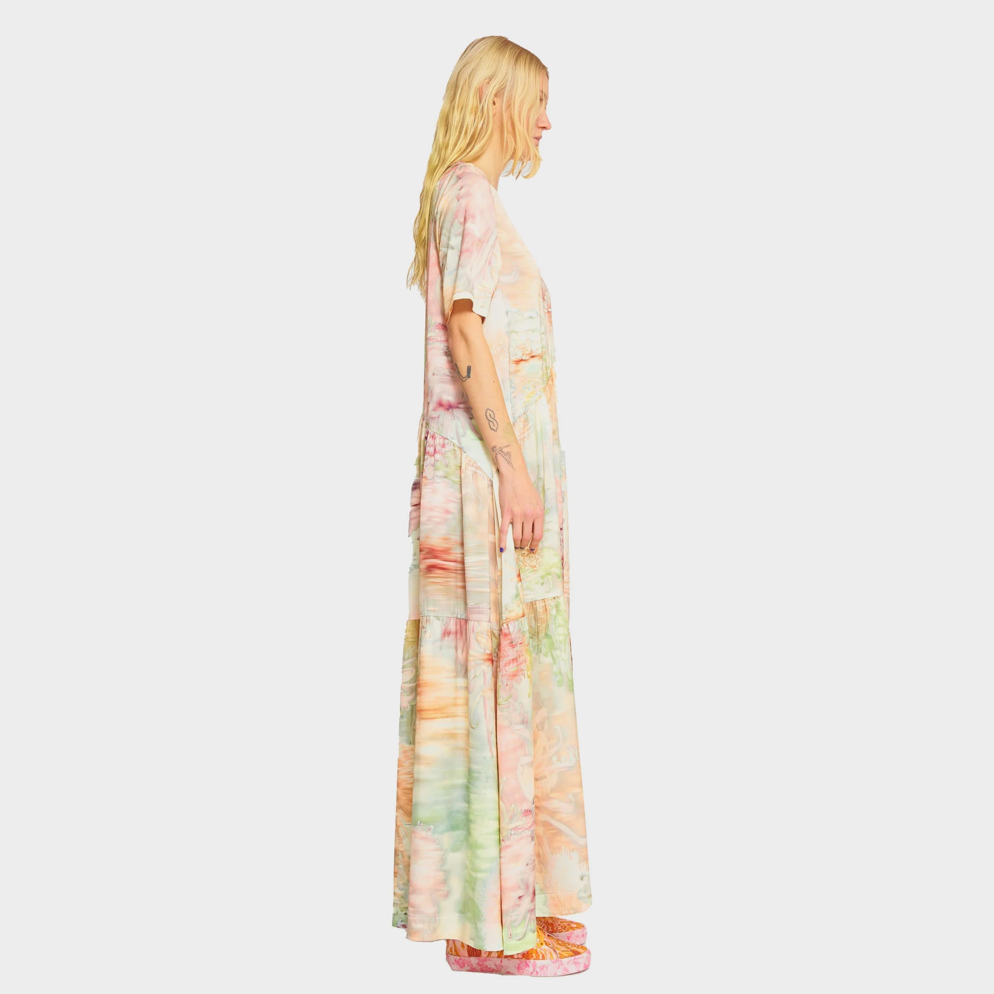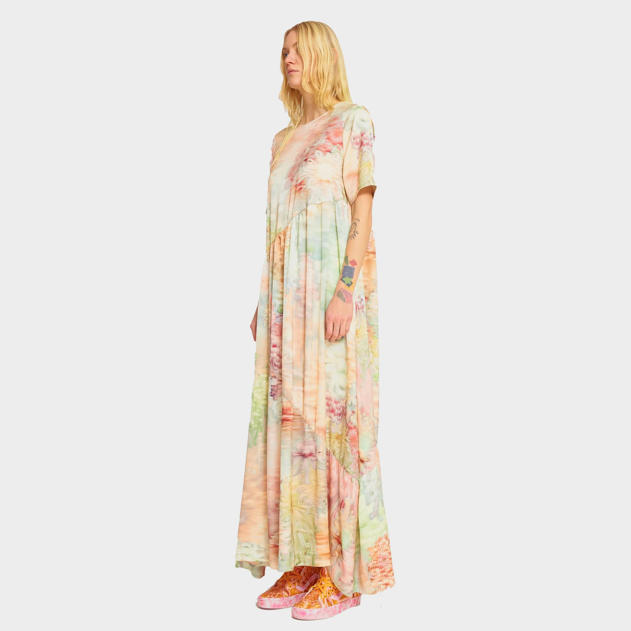 Long, short sleeve dress in silky satin. Three tiers with deep keyhole back. Hook and eye closure. All over custom Collina Strada Light Chrysanthemum print.