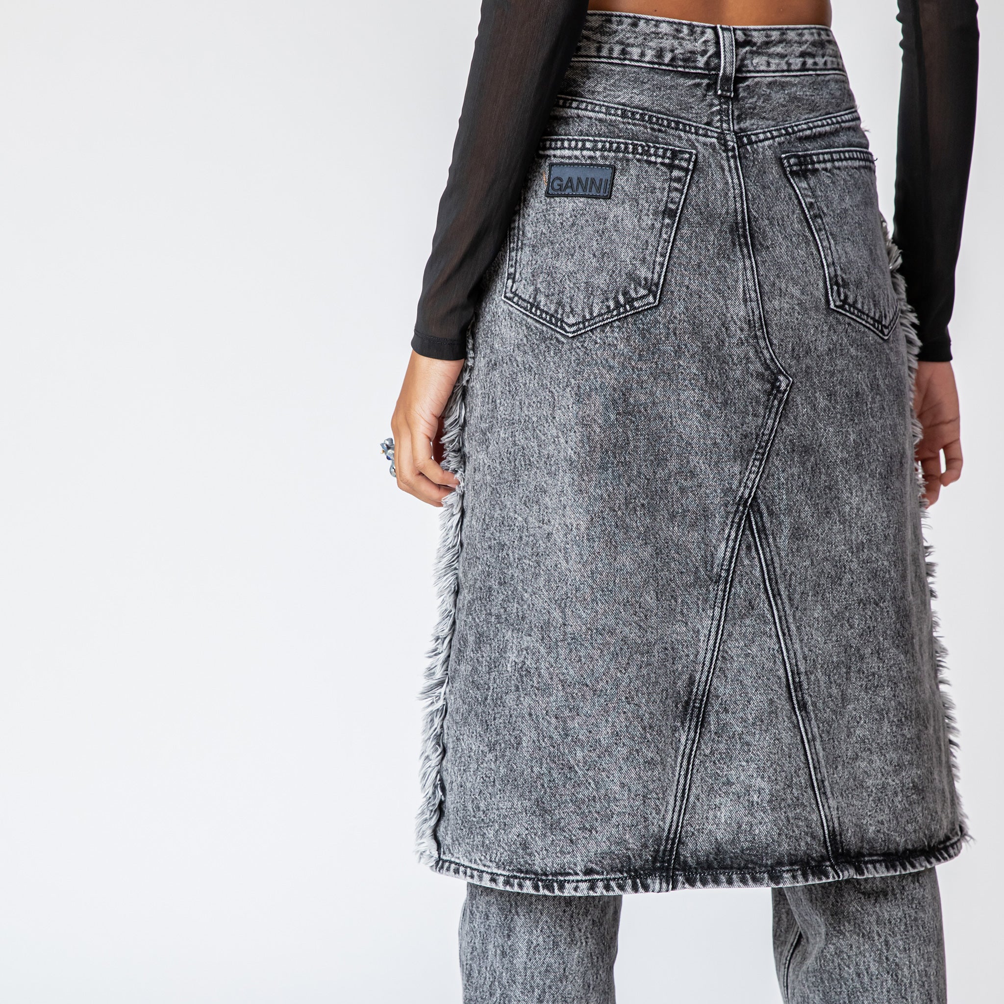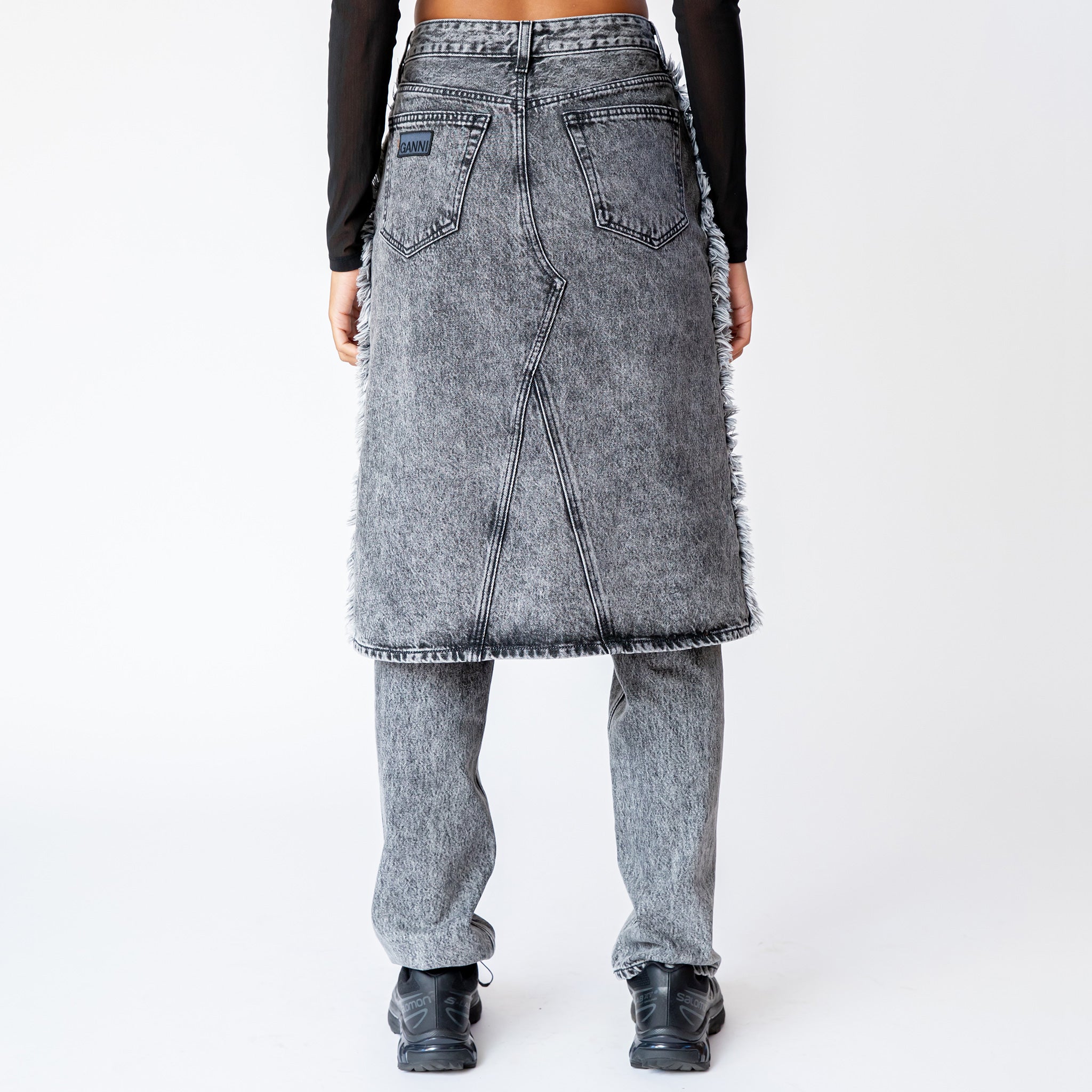 Organic cotton GANNI runway style featuring a combination slim fit jean and midi-length denim skirt in a faded black wash. Front and back pockets.