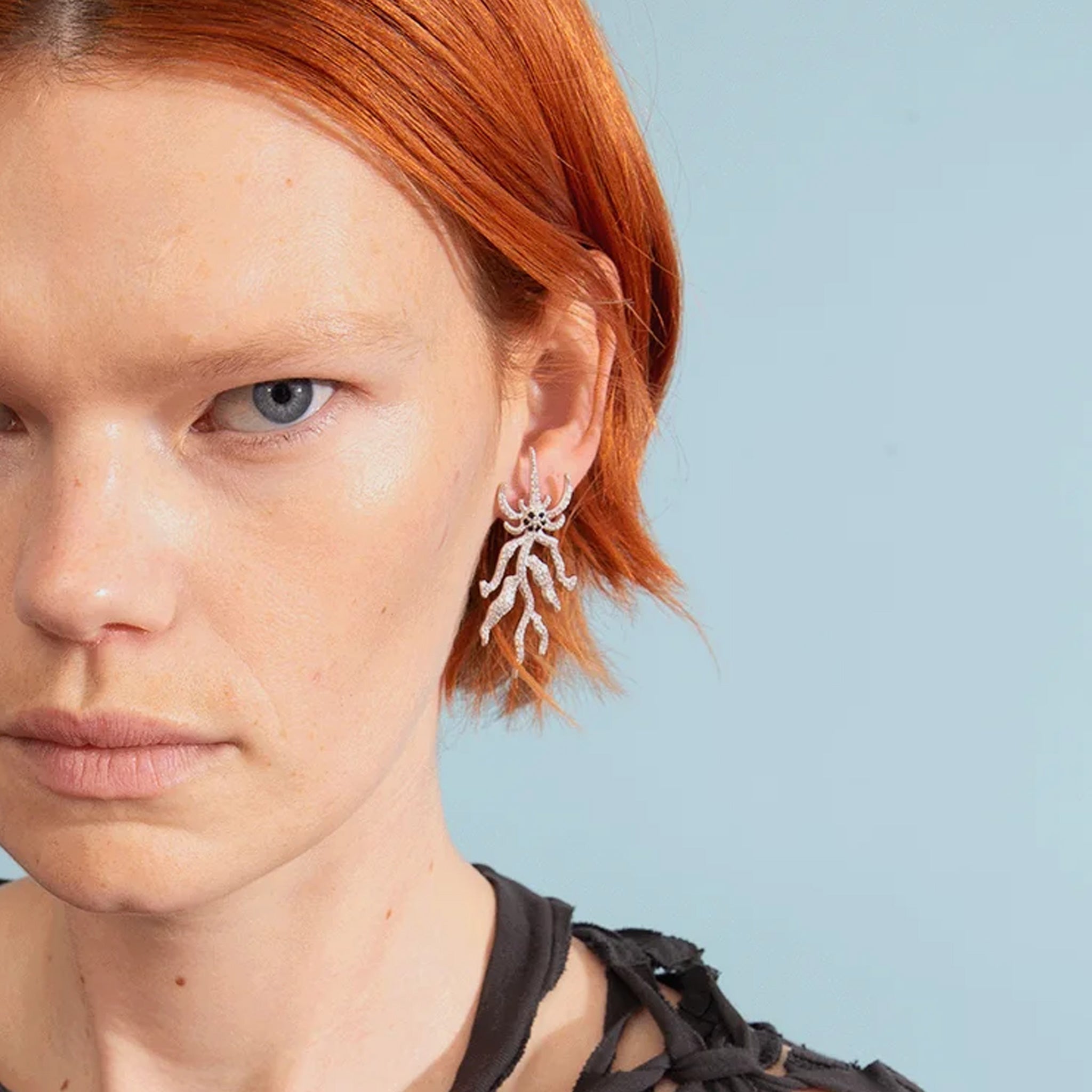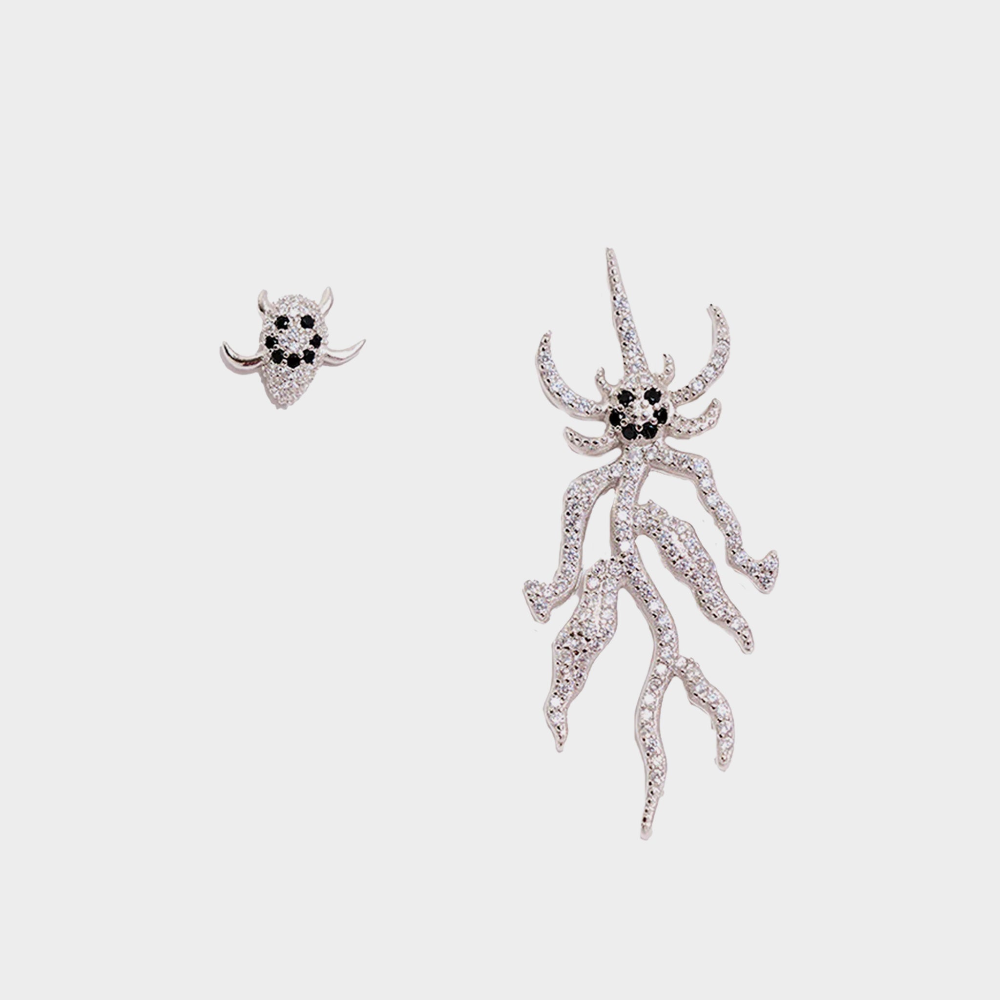 Sterling silver mixed pair spike monster earring encrusted in clear rhinestones. One large Spike Monster Earring and one Spike Monster Stud. Stud back.