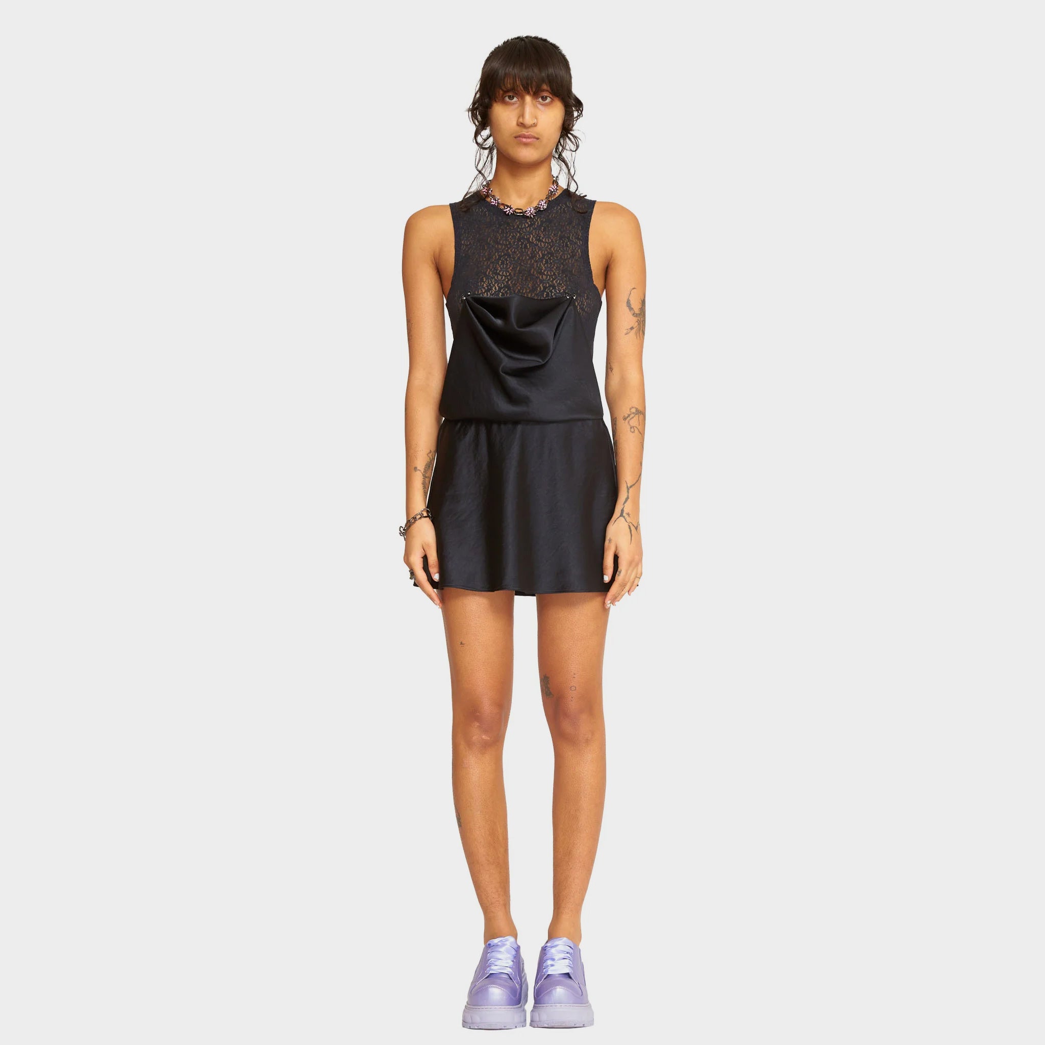 Our classic Dachi fit tank mini dress with embellished piercings at the chest and a gathered waist. Very short!