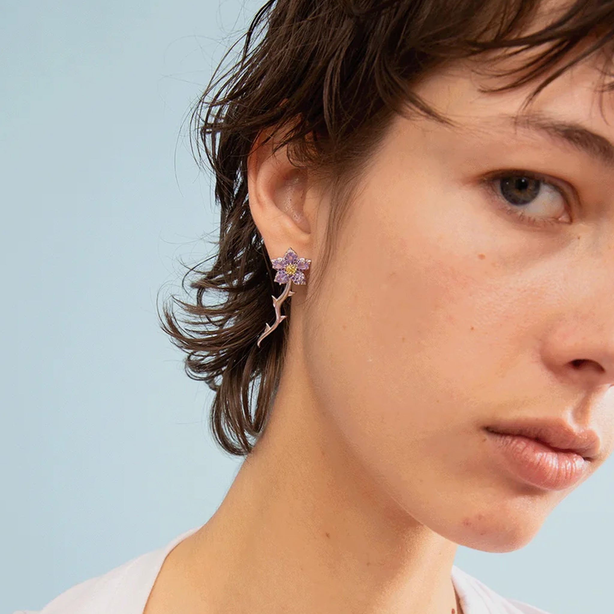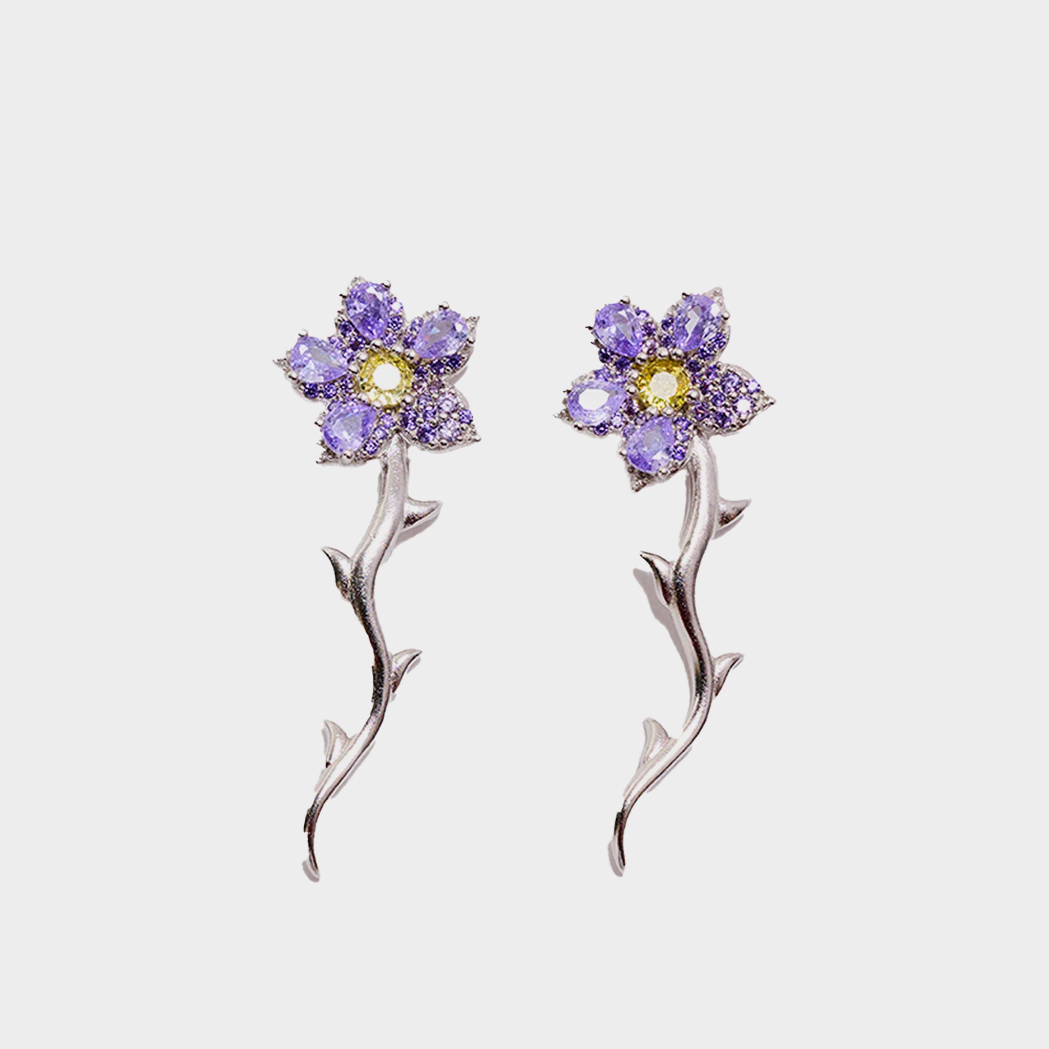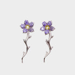 Sterling silver vine and flower earrings with amethyst gemstones and a lemon yellow center. Stud back.
